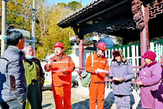 近日,国网衢州供电公司共产党员服务队走进浙江省衢州市开化县齐溪镇里秧田村,开展防山火特巡和电力普法宣传活动。图为服务队队员向返乡群众发放宣传手册,讲解安全用电知识。 陈晓锋 摄