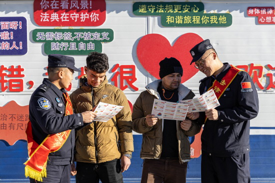 ▲ 近日,新疆出入境边防检查总站克州边境管理支队吐古买提边境派出所普法宣传小分队依托乡村巴扎日,通过案例讲解、发放资料等方式,开展反诈主题宣传。图为民警向群众宣讲反诈知识。