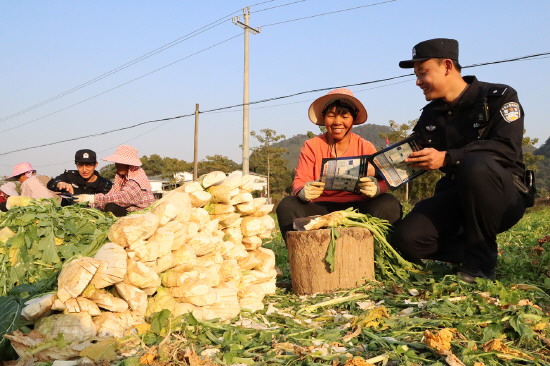 广西壮族自治区钟山县公安局清塘派出所近日组织警力走进田间地头,通过讲解典型案例、发放反诈宣传单等方式开展普法宣传。图为民辅警向村民宣讲反诈知识。