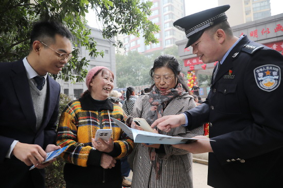 连日来,江西省九江市公安局浔阳分局庐南派出所民警走进社区,通过以案释法、互动答疑等方式,向群众讲解如何识别电信网络诈骗。图为1月17日,民警向社区居民宣传反诈知识。