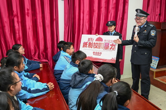 安徽省和县公安局民辅警近日走进功桥中学,向学生讲解预防校园欺凌知识。图为民辅警讲解如何抵制校园暴力。 本报通讯员 秦祖泉 摄