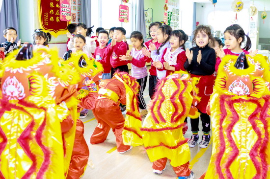 学前儿童学籍管理新规将在一定程度上约束家长,不让孩子提前到其他机构进行“填鸭式”学习,从容度过幼儿园丰富多彩的生活。图为新疆乌鲁木齐市一所幼儿园的孩子们在舞狮子,乐享冬日时光。