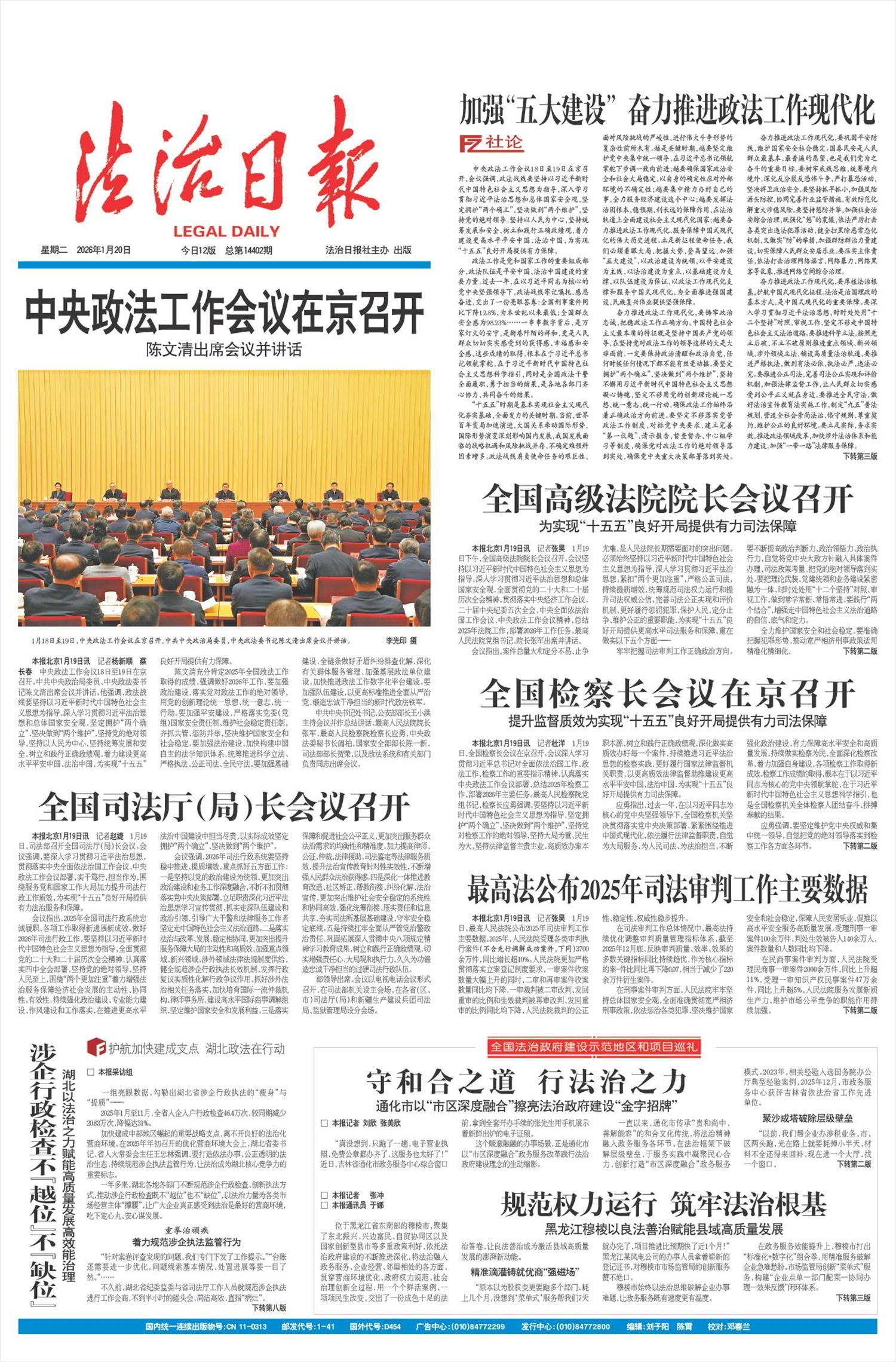 本报北京1月19日讯 记者杨新顺 蔡长春 中央政法工作会议18日至19日在京召开。中共中央政治局委员、中央政法委书记陈文清出席会议并讲话。他强调,政法战线要坚持以习近平新时代中国特色社会主义思想为指导,深入学习贯彻习近平法治思想和总体国家安全观,坚定拥护“两个确立”、坚决做到“两个维护”,坚持党的绝对领导,坚持以人民为中心,坚持统筹发展和安全,树立和践行正确政绩观,着力建设更高水平平安中国、法治中国,为实现“十五五”良好开局提供有力保障。