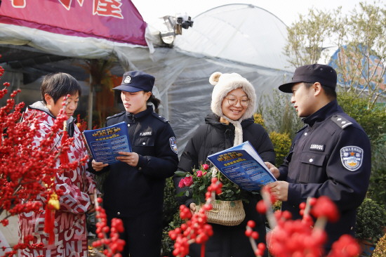 ▲ 近日,浙江省浦江县公安局组织民警开展“花市说反诈 守护平安年”主题宣传活动。民警通过发放反诈宣传单等形式向商户和消费者普及反诈知识。图为民辅警向花市顾客宣讲刷单诈骗、贷款诈骗等常见诈骗套路。