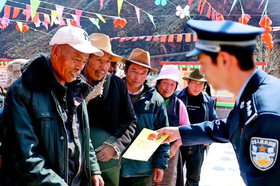图为西藏国安干警向藏区群众宣传国家安全法律法规。