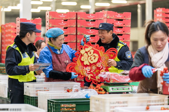 1月22日,上海市公安局崇明分局汲浜派出所组织民警深入辖区蔬果生产企业开展安全宣传。图为民警向企业员工讲解安全防范知识,并送上迎新春礼品。