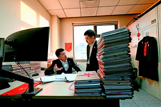 2025年12月31日,北京市朝阳区人民法院民三庭法官周裕财(左)与法官蔡传磊在办公室就一起债权代位权纠纷案中,债权人向次债务人主张债权的诉讼时效问题进行研讨。