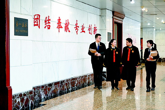 2025年12月31日,北京市朝阳区人民法院民二庭法官王菁璐(左二)与法官周剑彬(右二)在前往法庭的路上,分析案件审理思路。