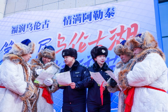 近日,第十九届乌伦古湖冬捕文化旅游节在新疆维吾尔自治区福海县乌伦古湖景区举行。乌鲁木齐铁路公安局奎屯公安处福海站派出所民警深入景区开展普法宣传。图为民警通过现场讲解等方式向群众普及铁路安全、防诈骗等知识。 本报记者 潘从武 本报通讯员 布克呼宜格 摄