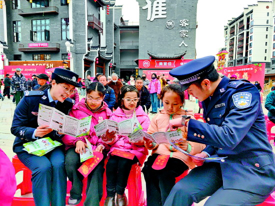 江西省石城县近日举办“我在新时代文明实践中心过大年”活动,石城县公安局禁毒大队以此为契机,积极开展禁毒宣传活动。图为民辅警向前来参与活动的未成年人讲解禁毒知识。 本报记者 周孝清 本报通讯员 卢碧琴 摄