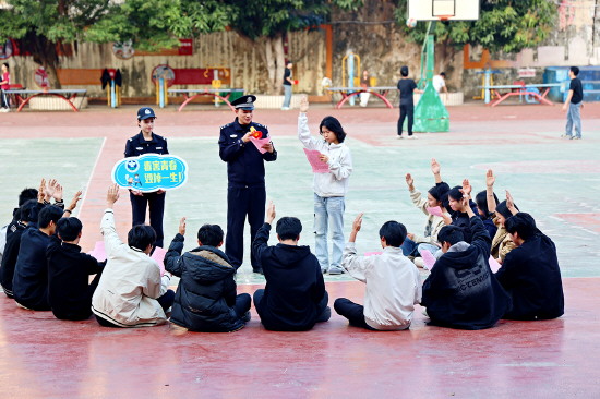 图③ 寒假临近,为增强学生安全意识,1月27日,广西壮族自治区陆川县公安局民警走进陆川县第二中学,通过案例讲述、互动交流等形式,开展寒假安全防范宣传。图为民警向学生讲解安全知识。