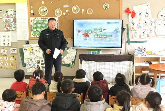 图② 连日来,浙江省台州市公安局椒江分局海门派出所民警深入中小学校、幼儿园,开展“快乐寒假 安全第一”主题宣传活动。图为1月28日,民警为孩子们讲解安全防范知识。