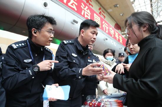 图③ 1月29日,在北京西站二楼候车平台,北京市天康戒毒康复所联合北京铁路公安处北京西站派出所等18家单位,共同举办春运安全主题宣传活动。图为天康戒毒康复所民警向群众展示仿真毒品模型。