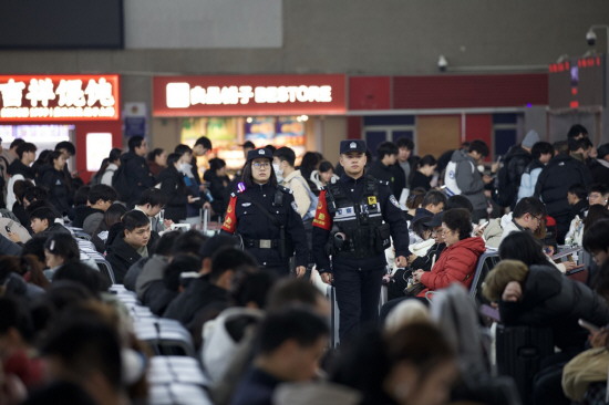 图① 2026年春运即将拉开帷幕,武汉铁路警方组织警力加强对管内大型车站的治安防控。图为武汉铁路公安处武昌站派出所民警在武昌站候车室执勤巡逻。