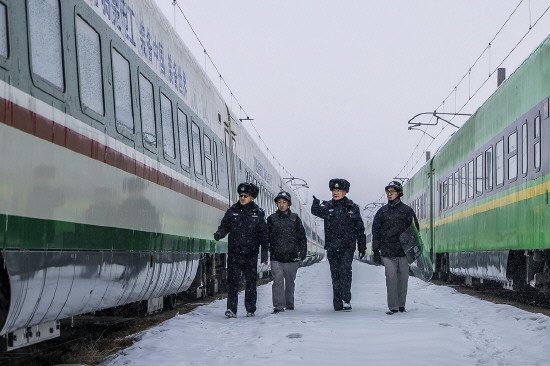 图② 1月29日,乌鲁木齐铁路公安局乌鲁木齐公安处乌鲁木齐西站派出所组织警力开展全面、深入的安全巡查专项行动,备战春运。图为民警正在巡查高铁线路。