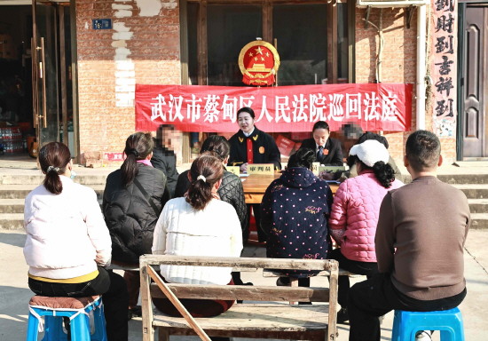 湖北省武汉市蔡甸区人民法院近年来不断创新司法服务形式,让巡回审判常态化、规范化,把公平正义送到田间地头、房前屋后。图为近日,蔡甸法院侏儒山法庭在新帮村举行一场“家门口”的巡回审判。