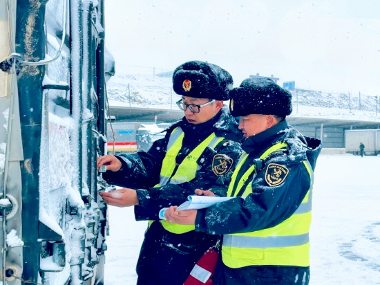 卡拉苏口岸是中国与塔吉克斯坦共和国唯一的陆路口岸。卡拉苏海关立足口岸功能定位,持续优化监管服务举措,进一步畅通国际物流大通道,助力卡拉苏口岸打造更具竞争力的对外开放新高地。图为1月23日,卡拉苏海关关员在货场口岸对车辆施封。