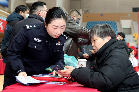 图③ 近日,江苏省宿迁市公安局宿城分局民警走进辖区春风行动大型招聘会,在招聘会现场设置公安反诈宣传展台,向现场群众普及电信网络诈骗的特点和防范知识。图为民警向招聘工作人员宣传反诈知识。