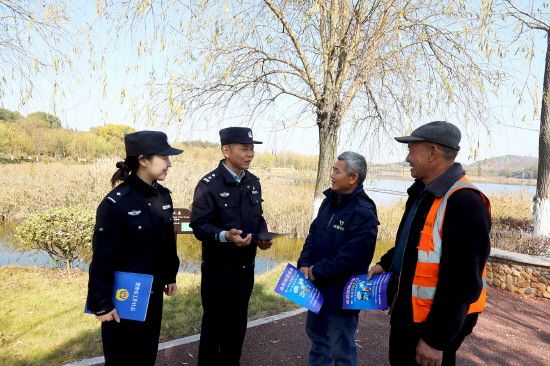 图② 连日来,江西省分宜县公安局组织民警深入辖区乡镇街道,开展“全民反诈 守护平安”主题普法宣传活动,民警通过发放宣传单、案例讲解、互动交流等方式,向群众讲解电信网络诈骗的惯用伎俩及防范措施。图为民警在分宜县湿地公园向群众宣传反诈知识。