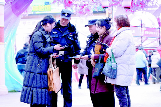 1月31日,2026年常州包子大会暨“苏味中国·过大年”非遗闹新春常州主场活动在常州中华恐龙园迪诺水镇举办。当天,江苏省常州市公安局高新区分局河海派出所环球恐龙城警务站民警走进集市,开展治安巡逻和安全宣传,确保活动安全有序进行。图为民警向群众讲解安全知识。 本报记者 罗莎莎 本报通讯员 高一鸣 摄