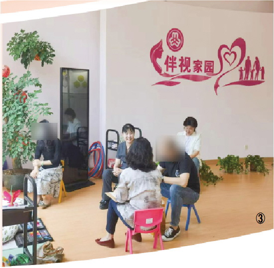 图③ 法官与心理咨询师在“伴视家园”和家长聊天谈心。