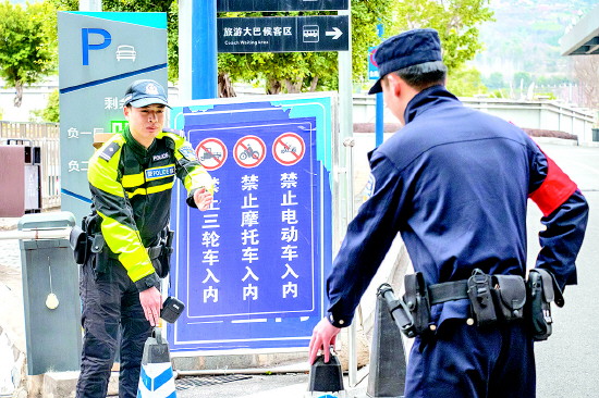 图② 近日,成都铁路公安局重庆公安处巫山站派出所联合巫山县公安局交通管理大队开展铁路车站周边交通秩序整治,全力确保2026年春运期间旅客安全畅通出行。图为民警在巫山站停车场入口优化交通标识。