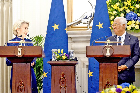 自欧盟委员会1月21日正式提出《数字网络法案》立法提案以来,欧盟领导人在多个场合力推该法案。图为当地时间1月27日,欧盟委员会主席冯德莱恩(左)与欧洲理事会主席科斯塔共同出席新闻发布会。 CFP供图