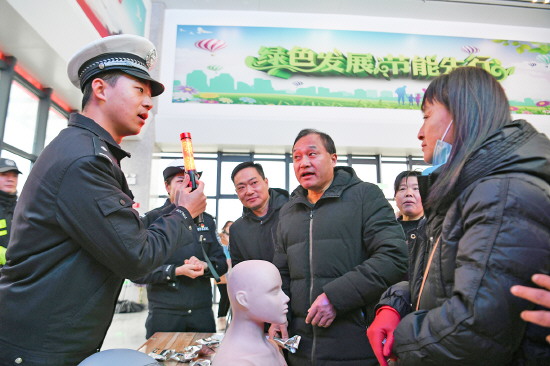 近日,安徽省含山县公安局交管大队组织民警在南门车站开展“平安春运·交警同行”主题宣传。图为民警向群众宣讲有关安全知识。