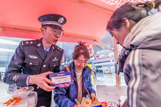 2月1日,徐州铁路公安处联合徐州东站开展“护航平安路 送福进万家”活动,民警在守护旅客平安出行的同时送去春联和新春祝福。图为活动现场。 本报记者 罗莎莎 本报通讯员 王睿 摄