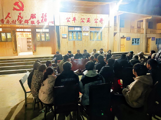 没有话筒,没有讲台,也没有明亮的会议室。村党群服务中心的院坝里,临时拉了两盏昏黄的白炽灯。灯下,四盆红彤彤的炭火正吐着火舌,二十来条高矮不一的农家板凳围成了一个不太规则的圆圈。