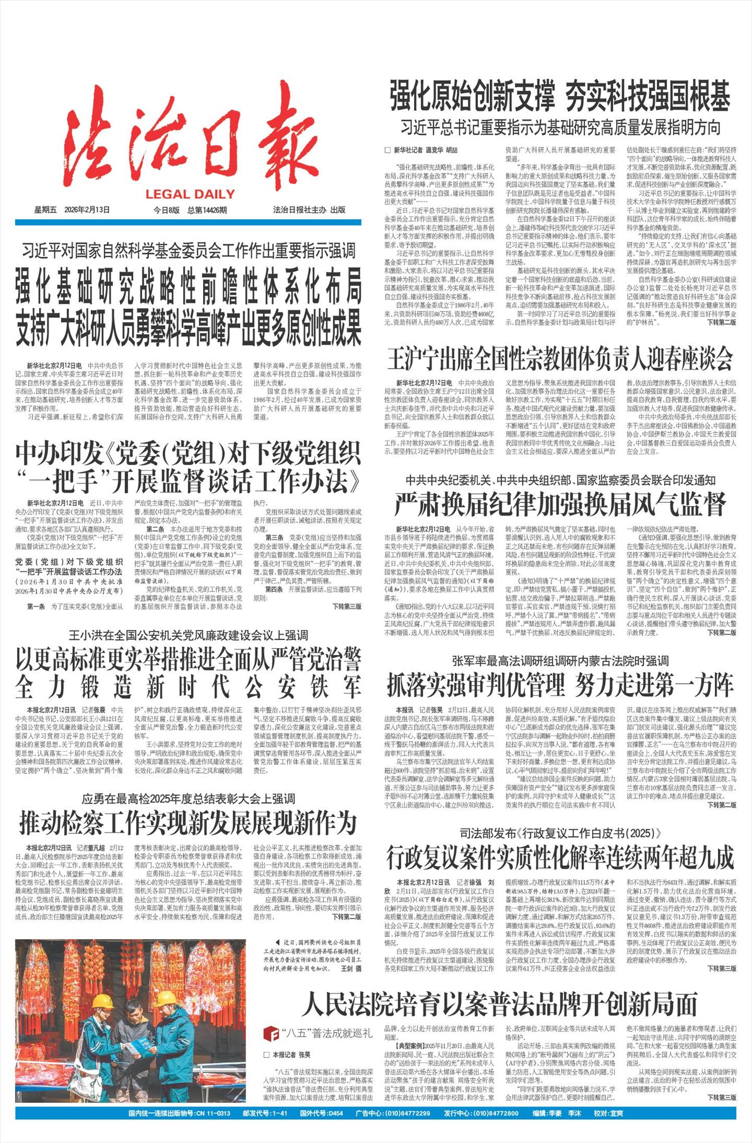 新华社北京2月12日电 中共中央政治局常委、全国政协主席王沪宁12日出席全国性宗教团体负责人迎春座谈会,同宗教界人士共庆新春佳节,并代表中共中央和习近平总书记,向全国宗教界人士和信教群众致以新春祝福。
