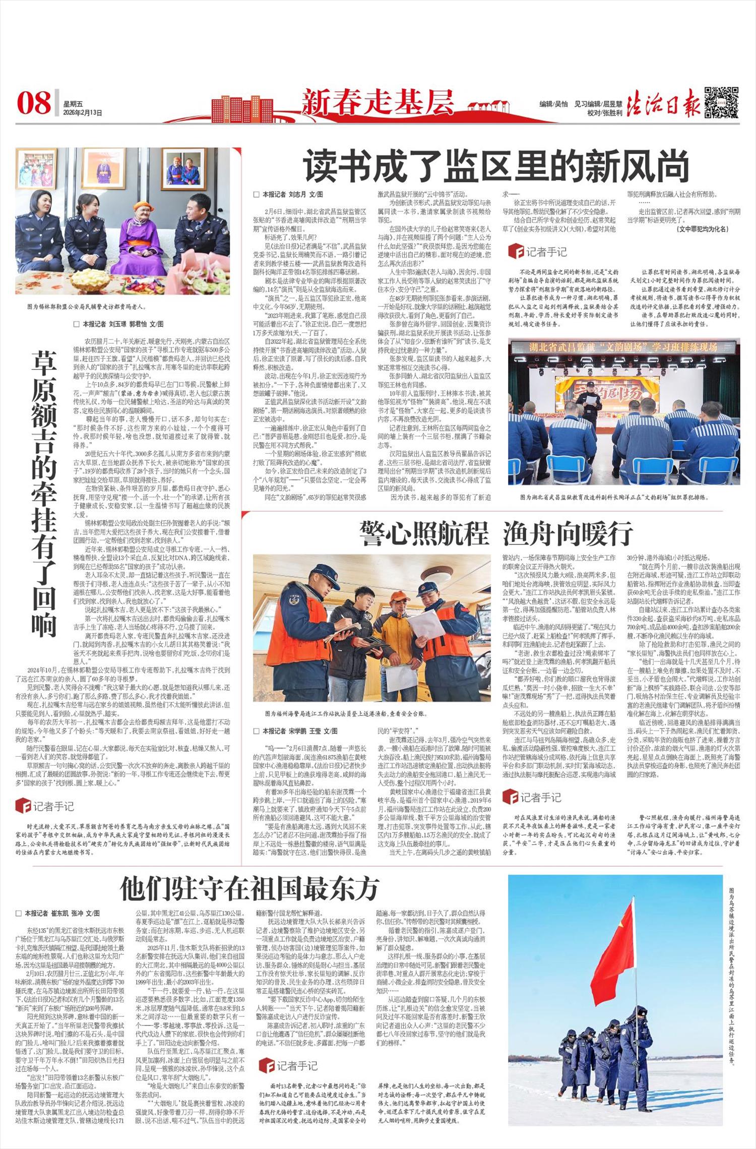 从巡边踏查到窗口答疑,几个月的东极历练,让“扎根边关”的信念愈发坚定。当被问及过年不能回家是否有落差时,新警王欣向记者道出众人心声:“这里的老民警不少都七八年没回家过春节,坚守的他们就是我们的榜样。”