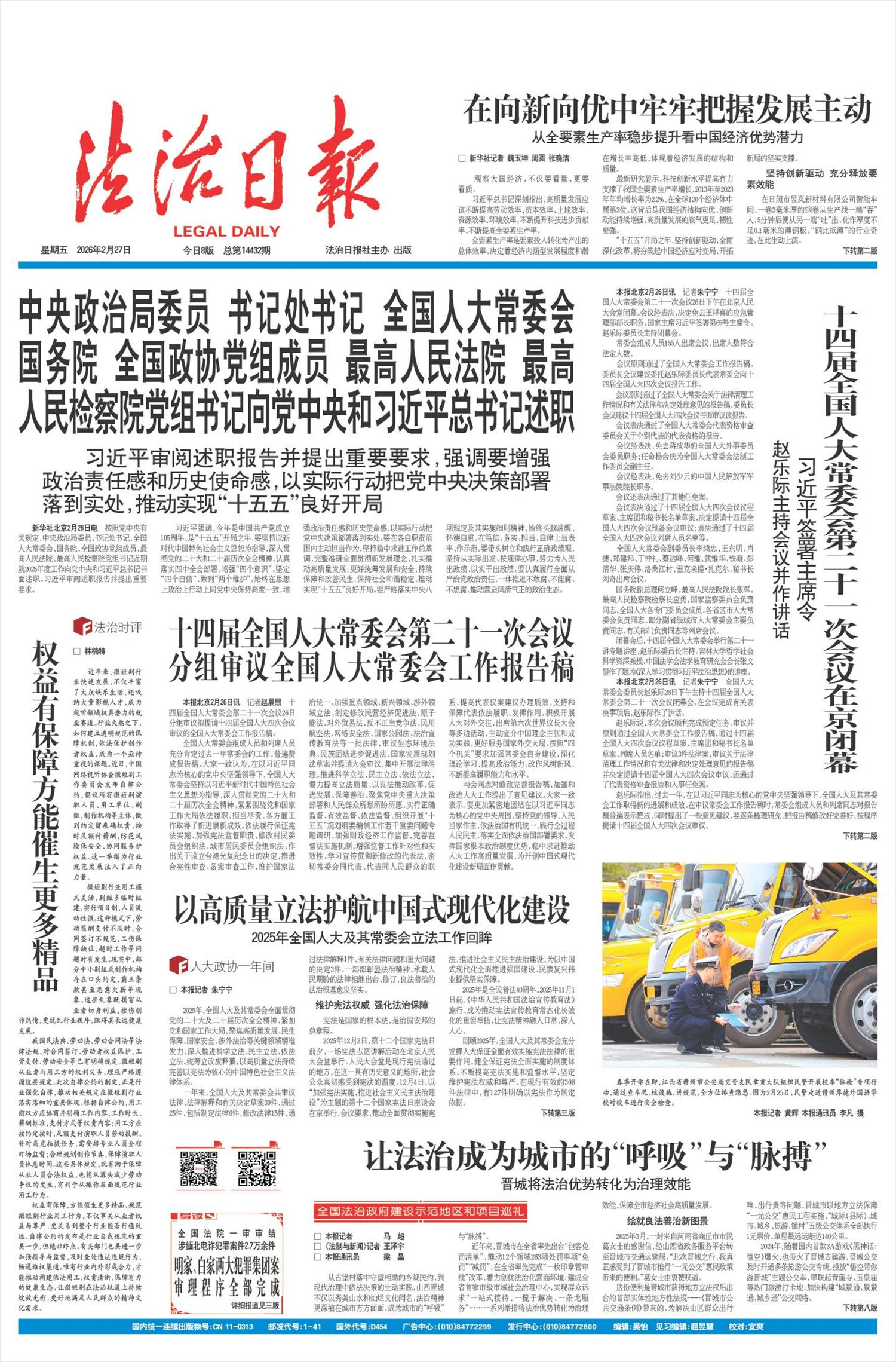 本报北京2月26日讯 记者朱宁宁 全国人大常委会委员长赵乐际26日下午主持十四届全国人大常委会第二十一次会议闭幕会。在会议完成有关表决事项后,赵乐际作了讲话。