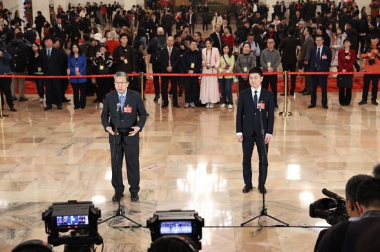 3月5日,十四届全国人大四次会议首场“代表通道”集中采访活动在北京人民大会堂举行。图为全国人大代表董进(左)正在回答记者提问。