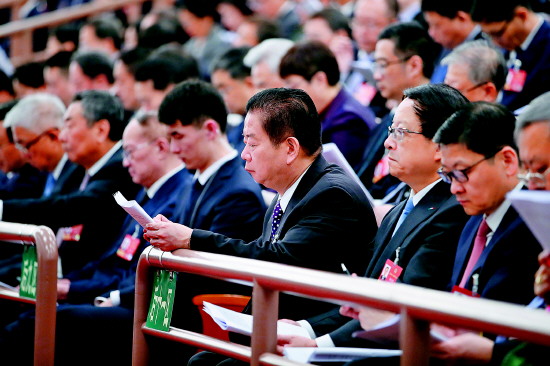图② 3月5日,列席十四届全国人大四次会议开幕会的全国政协委员在认真听会。