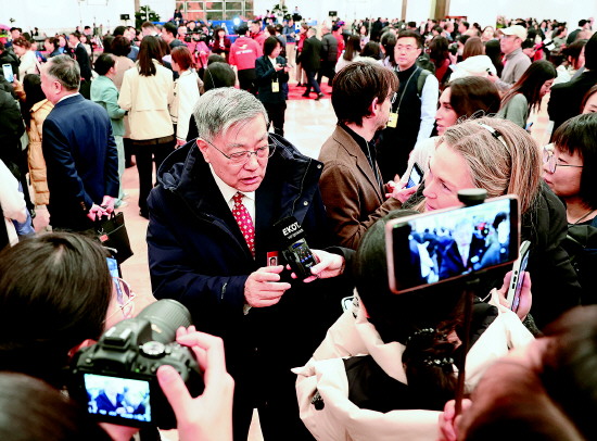 图③ 3月5日,十四届全国人大四次会议开幕前,全国人大代表、十四届全国人大常委会委员孙宪忠在接受媒体采访。 本报记者 徐伟伦 摄