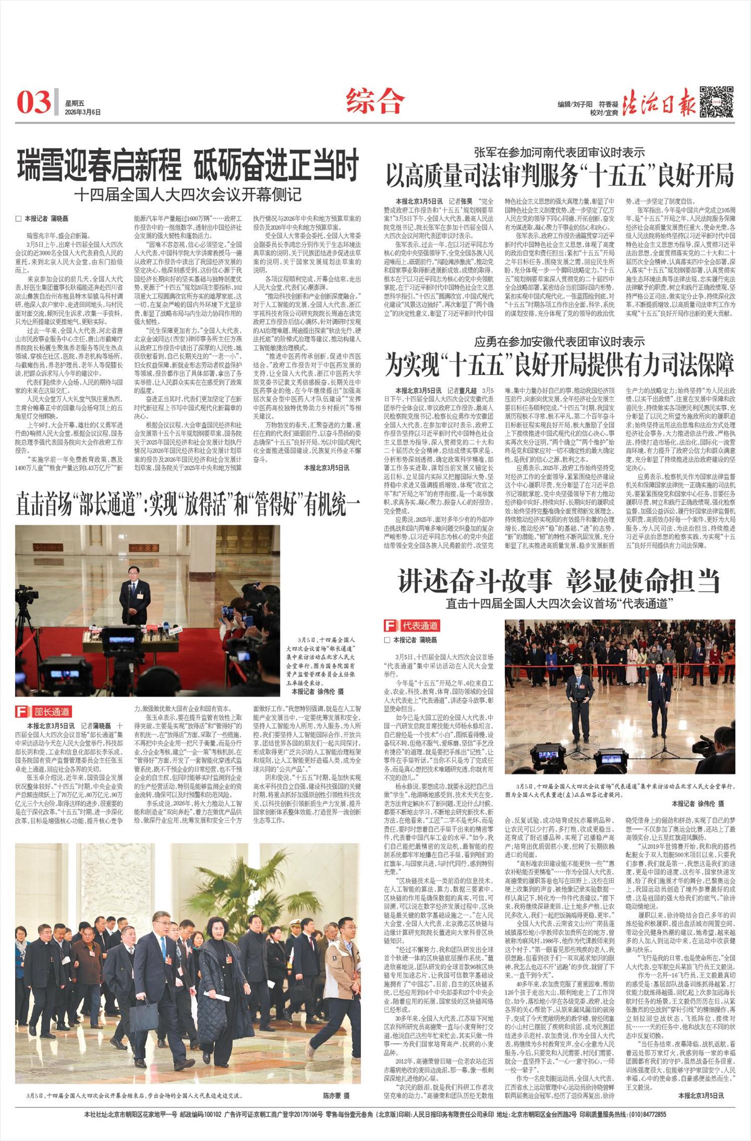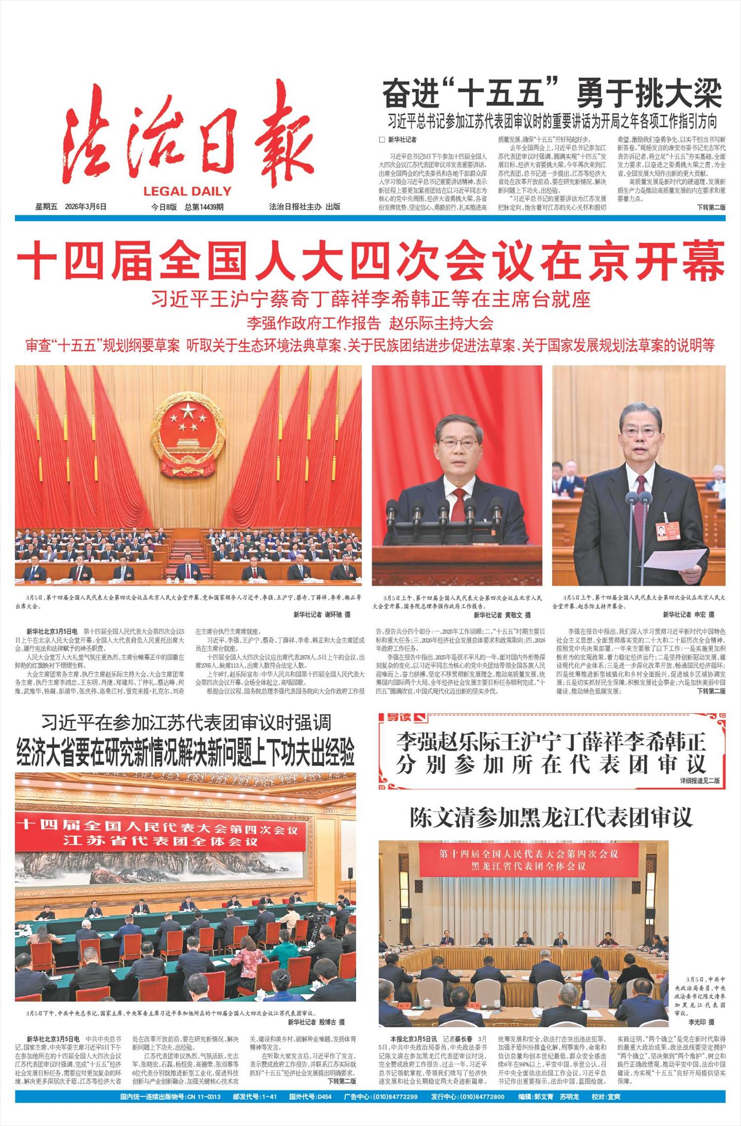 本报北京3月5日讯 记者蔡长春 3月5日,中共中央政治局委员、中央政法委书记陈文清在参加黑龙江代表团审议时说,完全赞成政府工作报告。过去一年,习近平总书记领航掌舵,带领我们续写了经济快速发展和社会长期稳定两大奇迹新篇章。统筹发展和安全,依法打击突出违法犯罪,加强矛盾纠纷排查化解,刑事案件、命案和信访总量均创本世纪最低,群众安全感连续6年在98%以上,平安中国,举世公认。召开中央全面依法治国工作会议,习近平总书记作出重要指示,法治中国,蓝图绘就。实践证明,“两个确立”是党在新时代取得的最重大政治成果。政法战线要坚定拥护“两个确立”,坚决做到“两个维护”,树立和践行正确政绩观,推动平安中国、法治中国建设,为实现“十五五”良好开局提供坚实保障。