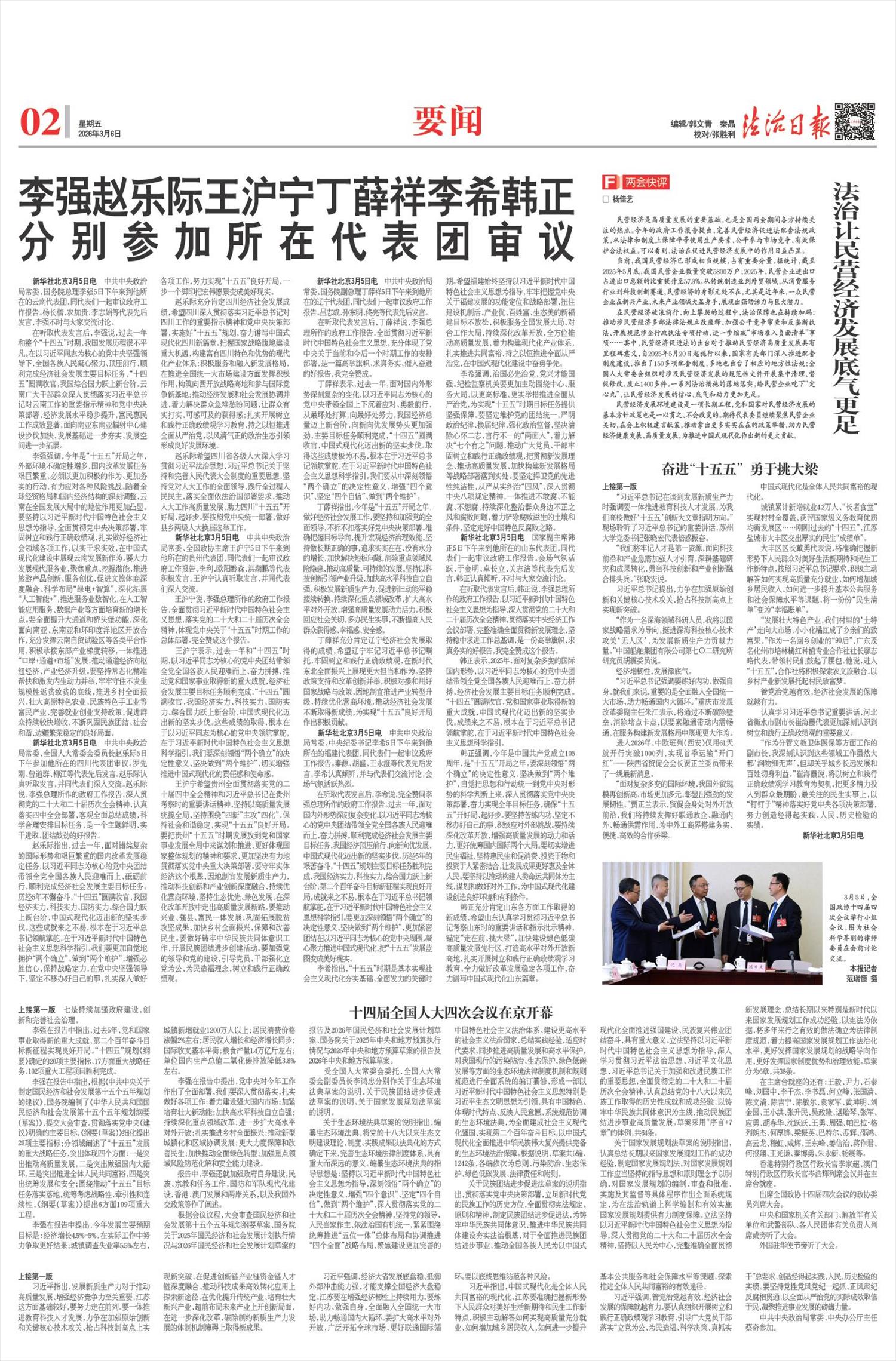 民营经济是高质量发展的重要基础,也是全国两会期间各方持续关注的热点。今年的政府工作报告提出,完善民营经济促进法配套法规政策,从法律和制度上保障平等使用生产要素、公平参与市场竞争、有效保护合法权益。可以看到,法治在促进民营经济发展中的作用日益凸显。