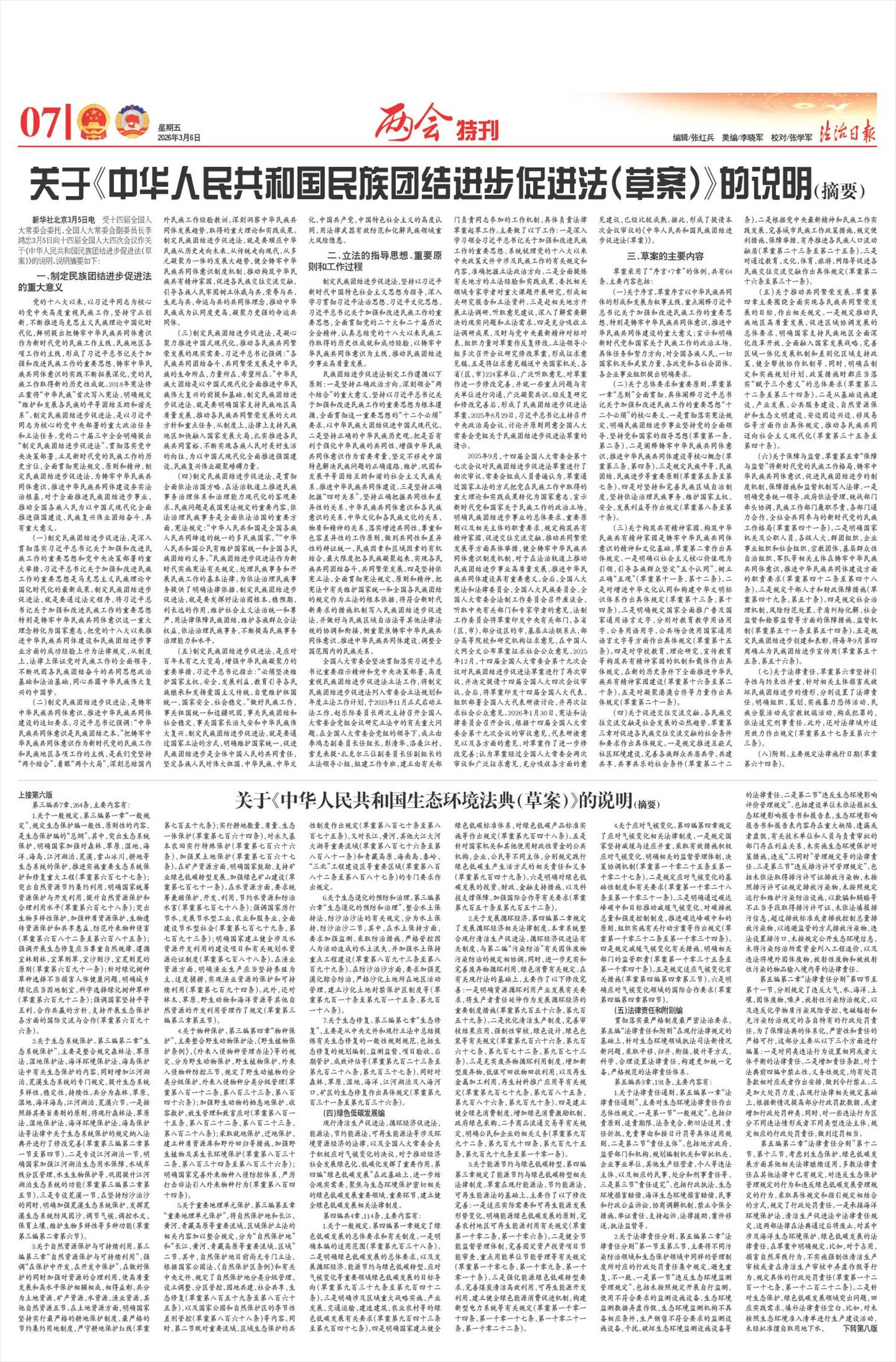 关于民族团结进步促进法草案的说明指出,贯彻落实党中央决策部署,立足新时代党的民族工作的历史方位,全面贯彻宪法规定、原则和精神,制定民族团结进步促进法,为铸牢中华民族共同体意识、推进中华民族共同体建设夯实法治根基,对于全面推进民族团结进步事业,推动全国各族人民为以中国式现代化全面推进强国建设、民族复兴伟业团结奋斗,具有重大意义。立法坚持以习近平新时代中国特色社会主义思想为指导,深入学习贯彻习近平法治思想、习近平文化思想、习近平总书记关于加强和改进民族工作的重要思想,全面贯彻党的二十大和二十届历次全会精神,认真总结党的十八大以来民族工作取得的历史性成就和成功经验,以铸牢中华民族共同体意识为主线,推动民族团结进步事业高质量发展。草案采用“序言+7章”的体例,共64条。