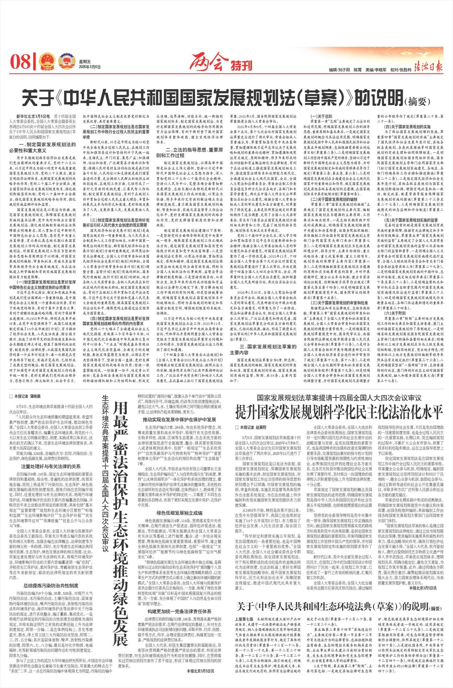 3月5日,国家发展规划法草案提请十四届全国人大四次会议审议。2025年4月和9月,全国人大常委会会议先后对国家发展规划法草案进行了两次审议,2025年12月进行了第三次审议。
