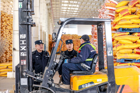 ▲ 为保障春耕物资运输安全畅通,近日,乌鲁木齐铁路公安局哈密公安处哈密站派出所组织警力深入哈密铁路货运中心开展专项安全检查,提醒管理人员严格落实防火巡查制度,及时消除安全隐患。图为民警叮嘱物流职工注意装卸安全。