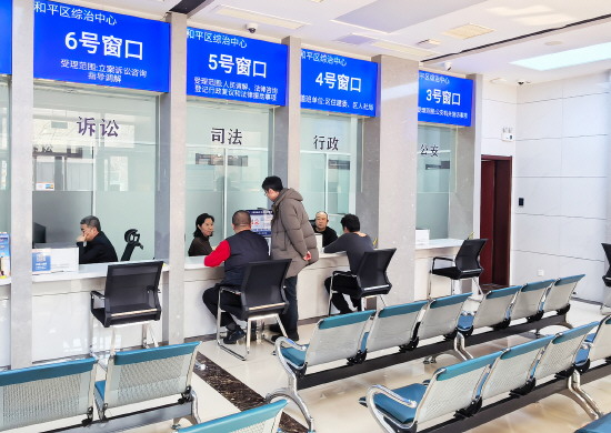 近年来,天津市和平区坚持和发展新时代“枫桥经验”,有效整合各方面资源力量,持续推动综治中心规范化建设,对群众反映的各项诉求“一站式接收、一揽子调处、全链条解决”。图为近日,群众在和平区综治中心服务窗口办理业务。 本报记者 范瑞恒 本报通讯员 闫傲 摄
