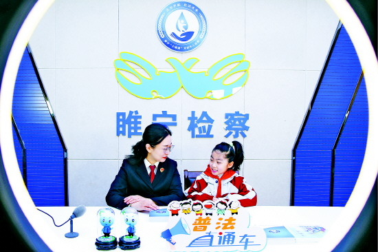 在全国中小学生安全教育日即将到来之际,江苏省睢宁县人民检察院“小雨滴”普法微课堂近日开展安全教育法治课拍摄,邀请小学生做客演播室,与检察官一起就校园安全、交通出行安全等进行互动交流。图为检察官与小学生在演播室互动交流。