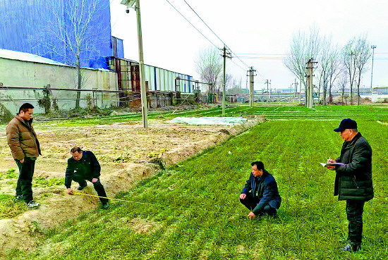 3月9日,濮阳市范县濮城镇综治中心调解员联合土地部门工作人员到耕地纠纷现场进行测量。