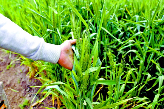 图为农民在埃及盖勒尤卜省的农田中展示因化肥供应受阻而长势不佳的麦穗。