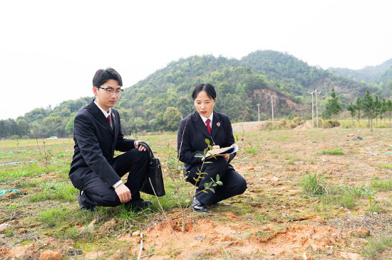 图为抚州市金溪县人民检察院干警在矿山修复现场查看植被生长情况。 吴志球 摄