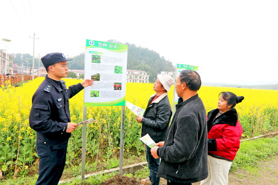 ▲ 近日,江西省分宜县公安局成立“民警+禁毒社工+村干部+网格员”禁种铲毒踏查小组,采取“空中巡查+人工踏查+宣传覆盖”方式推进禁种铲毒工作。图为民警在凤阳镇大路边村向村民普及禁毒法律法规知识。 本报记者 黄辉 本报通讯员 黄小军 摄