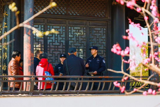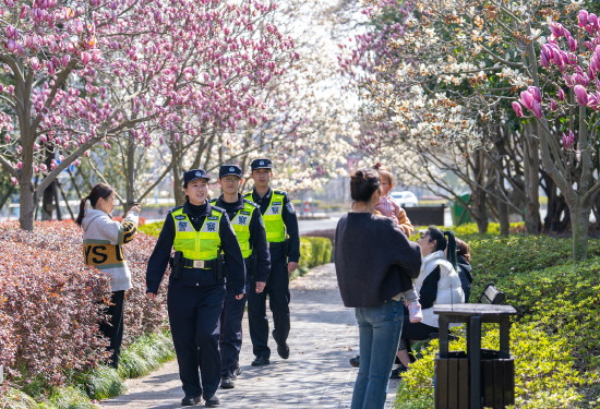 ▲ 近日,上海市公安局崇明分局城桥派出所组织警力在游客赏花踏青的新城公园开展常态化巡防和反诈宣传工作。图为民警正在公园巡逻。 本报通讯员 沈群 摄