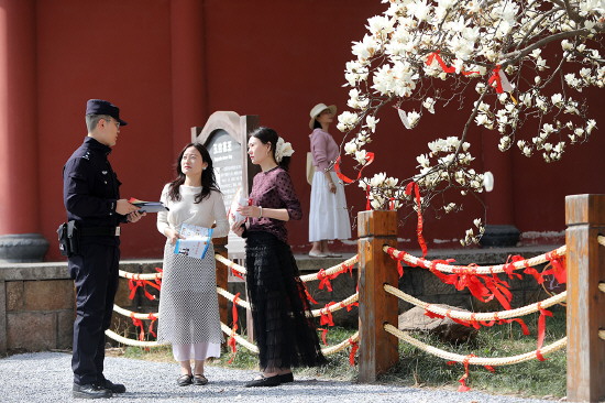 图② 连日来,江苏省连云港市公安局云台山风景名胜区分局云台派出所组织警力强化景区巡逻,并加强生态环境保护普法宣传,提醒游客文明观赏。图为民警向游客普及保护古树名木的法律法规。