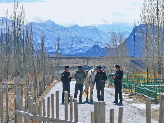 图④ 近日,新疆克州边境管理支队膘尔托考依边境派出所警务站民警深入辖区进行普法宣讲,向群众普及防范电信网络诈骗、边境法律法规知识。图为民警向群众宣讲反诈知识。
